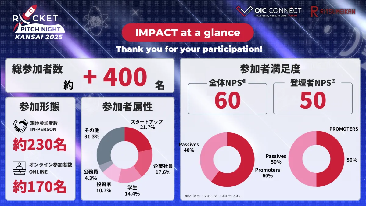 2025年9月5日、立命館大学大阪いばらきキャンパスで、日本最大級の起業家イベント「ROCKET PITCH NIGHT KANSAI 2025」が開催されました。主催は、世界16都市に展開してイノベーションを促進するVenture Café Tokyoと、社会への価値創造を目指す学校法人立命館起業・事業化推進室(RIMIX)です。
