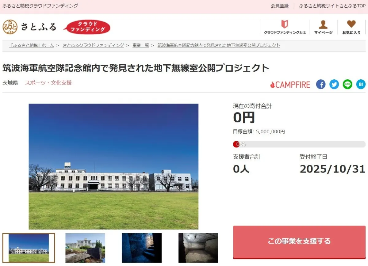 近年、日本社会において戦争の記憶を風化させずに伝える重要性が高まっています。その流れを受け、茨城県は「筑波海軍航空隊記念館」内にて発見された地下無線室の公開プロジェクトを立ち上げました。このプロジェクトは、ふるさと納税ポータルサイト「さとふる」を運営する株式会社さとふるとの共同で進められます。2025年8月6日からクラウドファンディングが開始される予定で、寄付金の目標額は500万円です。
