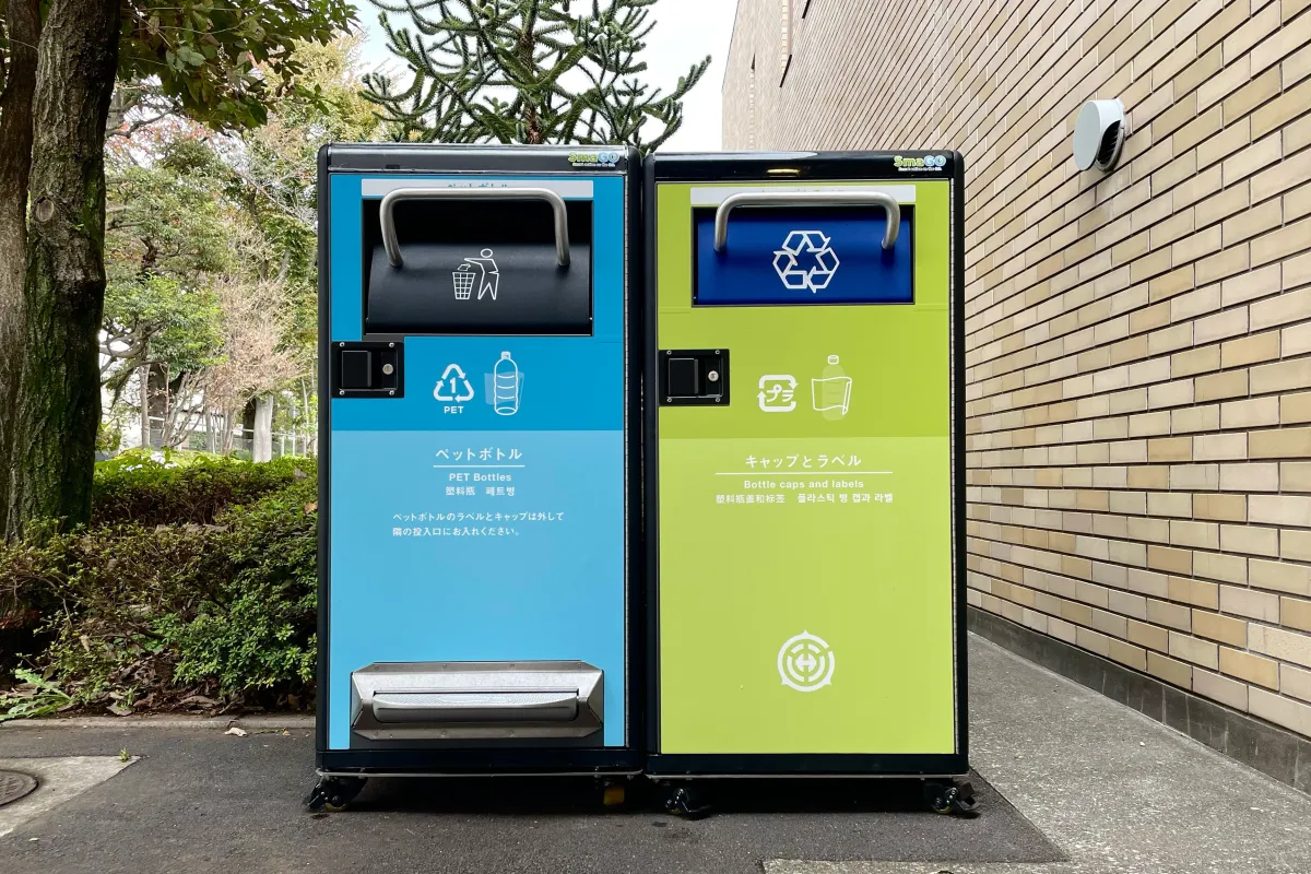 「むさしのエコreゾート」は市民と事業者、行政が共に環境について学び、行動するためのスポットです。ここに設置されたSmaGOは、ペットボトル専用のボックスと、キャップやラベル専用のボックスを一つの場所に配置し、利用者が簡単に分別できるよう工夫されています。デザインにはエコを象徴する緑と青を使用し、直感的に理解できるようなピクトグラムも計画されています。