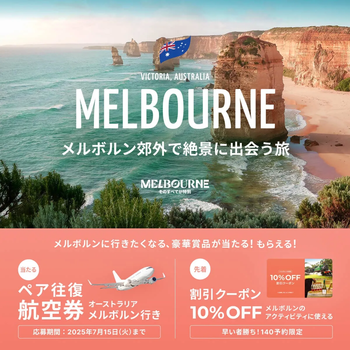 メルボルンへの旅をさらに特別なものにするため、ベルトラは抽選で「東京(成田)⇔メルボルン往復航空券」をプレゼントします。キャンペーンの応募期間は2025年4月16日から7月15日までとし、日本国内在住の20歳以上の方が対象です。詳細は特設ページをご覧ください。