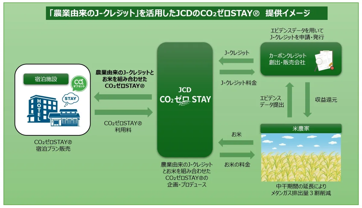 2025年6月より、株式会社JTBコミュニケーションデザイン(以下、JCD)は、宿泊に伴うCO₂排出を相殺する「CO₂ゼロSTAY🄬」において、農業由来のJ-クレジットを活用した新しい取り組みを始めました。このプランにより、宿泊者は環境保護に貢献しながら、農業の温室効果ガス削減や生産者支援にリアルに参加できる選択肢が生まれます。