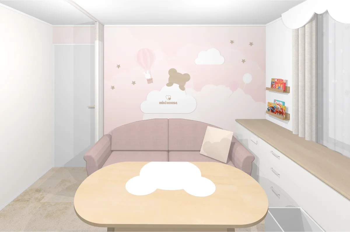 新設されるミキハウスコラボルームは、デザインテーマを「空から舞い降りた新しい家族」とし、企業の世界観を柔らかく取り入れた内装が特徴です。家族での記念撮影を考慮した空間設計になっており、居心地も良好です。