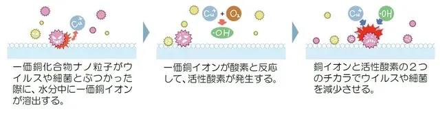 Cufitec®に含まれる一価銅イオンは、二価銅イオンよりも酸化されやすい性質を持っています。これにより活性酸素が発生し、微生物に対して強力な抑制効果を発揮します。このプロセスがCufitec®の即効性や高い抗ウイルス・抗菌効果を生み出しています。