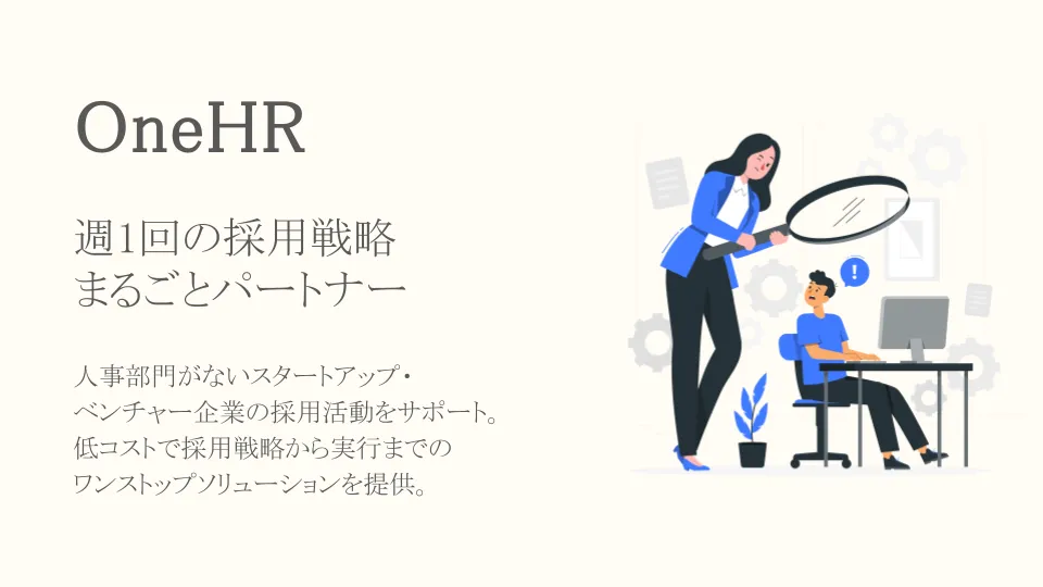 「OneHR」は、創業したばかりの企業や人事部門がまだ整備されていないベンチャー企業を主な対象としています。具体的には、週に一度のペースで企業の採用戦略を見直し、実行支援することが特徴です。これにより、企業は必要な採用業務を効率的に進めることができ、経営に専念する時間を確保できます。