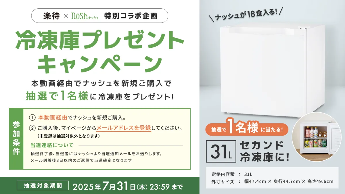 キャンペーン参加者は、ナッシュの動画を通じて新規購入をすることで、抽選でセカンド冷凍庫をゲットするチャンスもあります。抽選の対象は2025年7月31日までの期間となっており、参加するためには購入後にマイページからメールアドレスを登録する必要があるので、忘れずに登録しましょう。