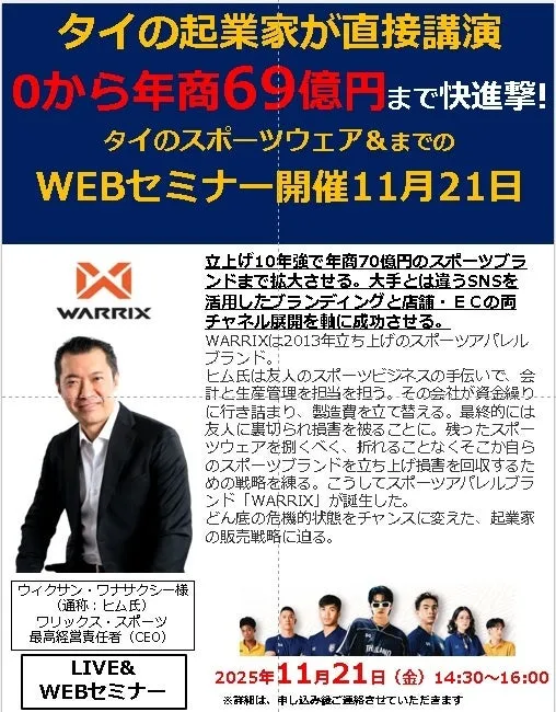 東南アジアのタイにおいて急成長を遂げたスポーツウェア企業、WARRIX社がその成功の軌跡を語るセミナーが開催されます。このセミナーでは、WARRIX社のCEOであるヒム氏がゲスト講師として登壇し、ビジネスの立ち上げから現在の年商70億円規模に至るまでの過程を共有します。特に、