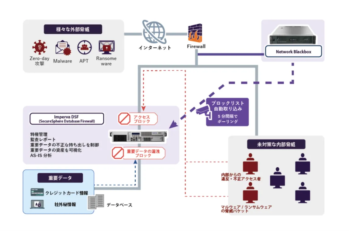 具体的には、「Network Blackbox」が検知した脅威情報をImpervaのFirewallが自動取得し、設定したセキュリティルールに基づいて該当ユーザーのデータベースアクセスを遮断します。なお、ユーザー側のセキュリティ状態が改善されると、ブロックは自動的に解除される仕組みです。これにより、ネットワーク層からアプリケーション層にわたる脅威を統合的に防御することが可能です。