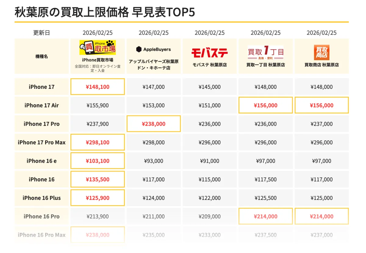 新しい記事の最初には、各店舗の買取上限価格を一目で確認できる「早見表」が設置されており、この情報は週に2回以上、定期的に更新されています。これにより、ユーザーは市場の動向を瞬時に把握でき、複数の業者からの相見積もりを取得する手間を省くことができます。具体的には、たとえば急な価格変動にも迅速に対応できる仕組みとなっています。