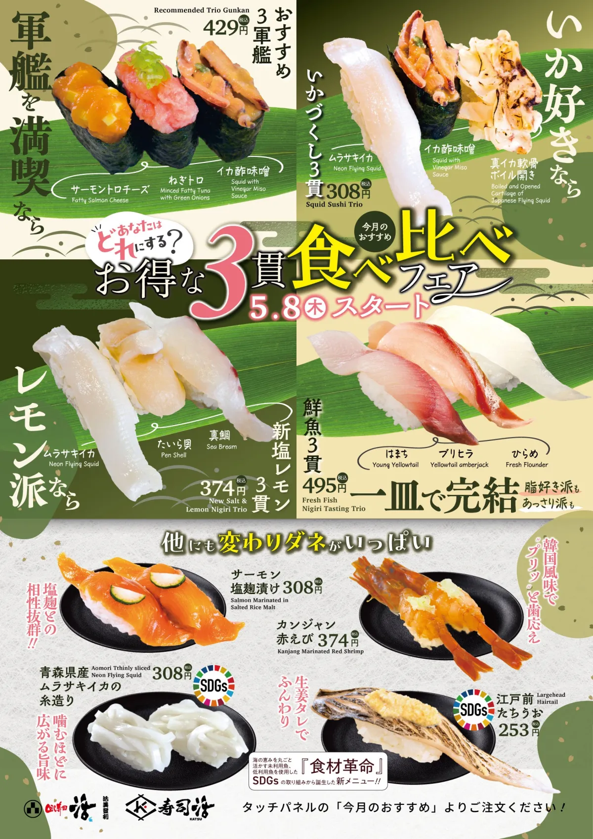 真鯛、たいら貝、ムラサキイカの新塩レモンを楽しむ3貫(374円)や、はまち、ブリヒラ、ひらめの鮮魚3貫(495円)など、あらゆるシーンにぴったりな選択肢が豊富です。また、サーモン塩麹漬け(308円)や、韓国風味のカンジャン赤えび(374円)、青森県産ムラサキイカの糸造り(308円)など、SDGs対象のメニューもあるので、環境に配慮した食事も楽しめます。