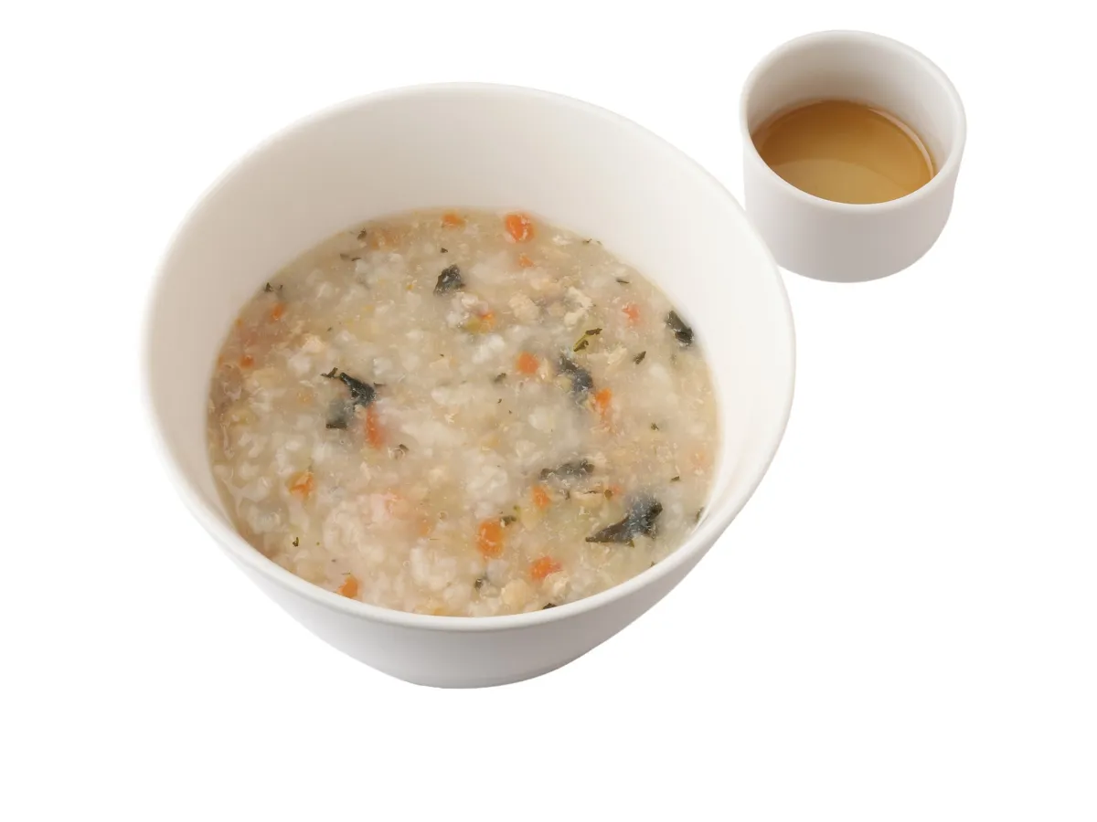 「あごだし香る和風粥」は、焼きあごや昆布、鰹節を贅沢に使用した、ふわりと香る優雅な和風粥です。うるち米に、スケトウダラやにんじん、小松菜、油揚げといった具材を加え、見た目にも美しい彩りが楽しめます。香ばしさを引き立てるための別添えのごま油もあり、これをかけることでさらに風味が増します。このメニューは、時間限定でイートインのみの提供となっていますが、お家でも楽しめるレトルトパウチ商品も発売されます。_