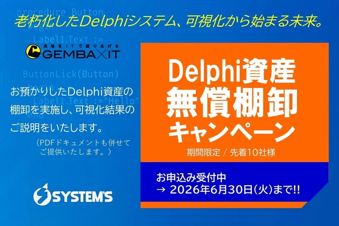 株式会社システムズは、2026年3月から「Delphi資産無償棚卸キャンペーン」を開始します。このキャンペーンは、2025年に実施した「VB資産可視化無償棚卸キャンペーン」の成功を受けたもので、目的はDelphi(デルファイ)資産のブラックボックスを解消し、企業のデジタルトランスフォーメーション(DX)を支援することです。_