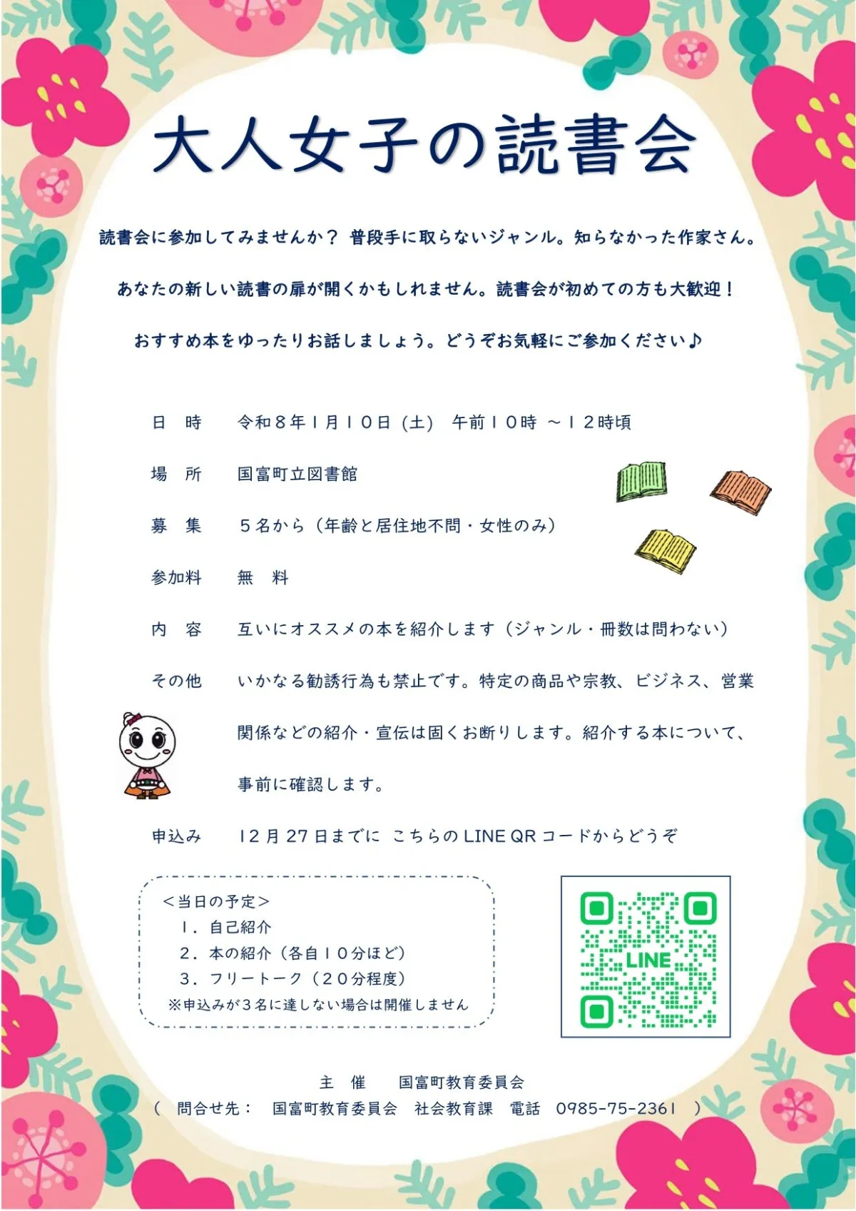 読書会は、2024年1月10日(土)午前10時から12時の約2時間、国富町立図書館で行われます。参加は女性限定で、年齢や居住地は問いません。参加料はなんと