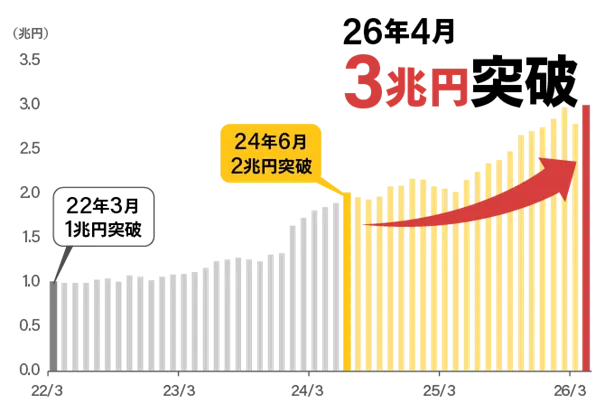 併せて、ポイントを用いた投資信託の購入や積立方法の多様化にも取り組んでいます。具体的には、「d払い残高積立」や、2026年3月にスタートした「JCBのクレカ積立」など、新しい購入手段を提供し、利用の幅を広げています。これにより、既存のお客様に加えて、新たに利用を始めた方々からも多くの支持を受けており、投資信託残高は約1年10ヶ月で1兆円も増加しました。
