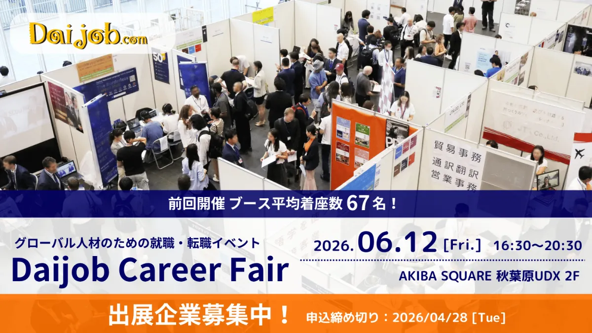 ヒューマングローバルタレント株式会社が主催する「第60回Daijob Career Fair」が、2026年6月12日(金)にAKIBA SQUAREで開催されます。このイベントは、ビジネス環境においてバイリンガルの能力を持つ求職者と企業をつなぐ重要な機会です。企業からの出展申し込みが本日より受け付けられています。