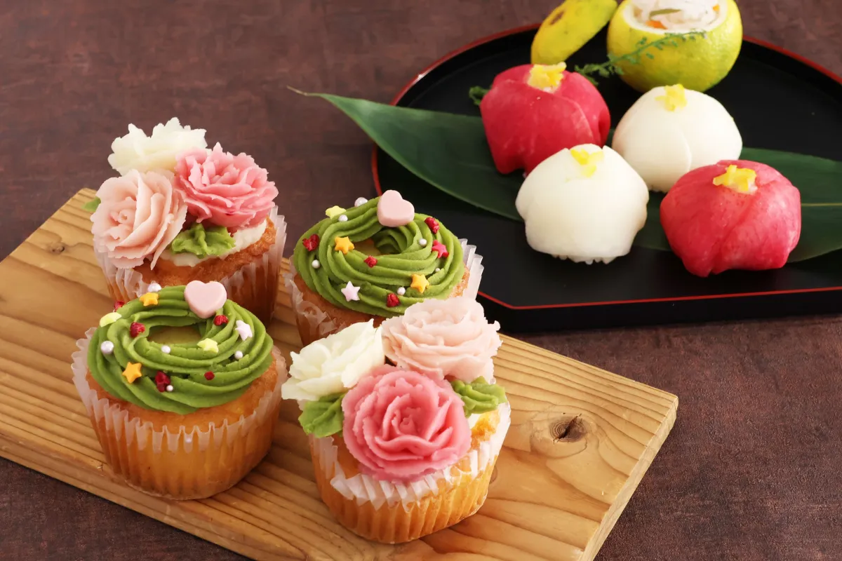 参加者たちは初めての花絞りに挑戦し、あんこを巧みに使って見た目にも美しいカップケーキを完成させました。白あんとビーツパウダーを組み合わせることで、色彩豊かな花々を絞り出しました。また、抹茶を用いたカップケーキは、まるでクリスマスリースのような魅力を放っていました。参加者たちが集中して取り組む姿勢が印象的で、出来上がった作品を嬉しそうに撮影する姿も多く見られました。