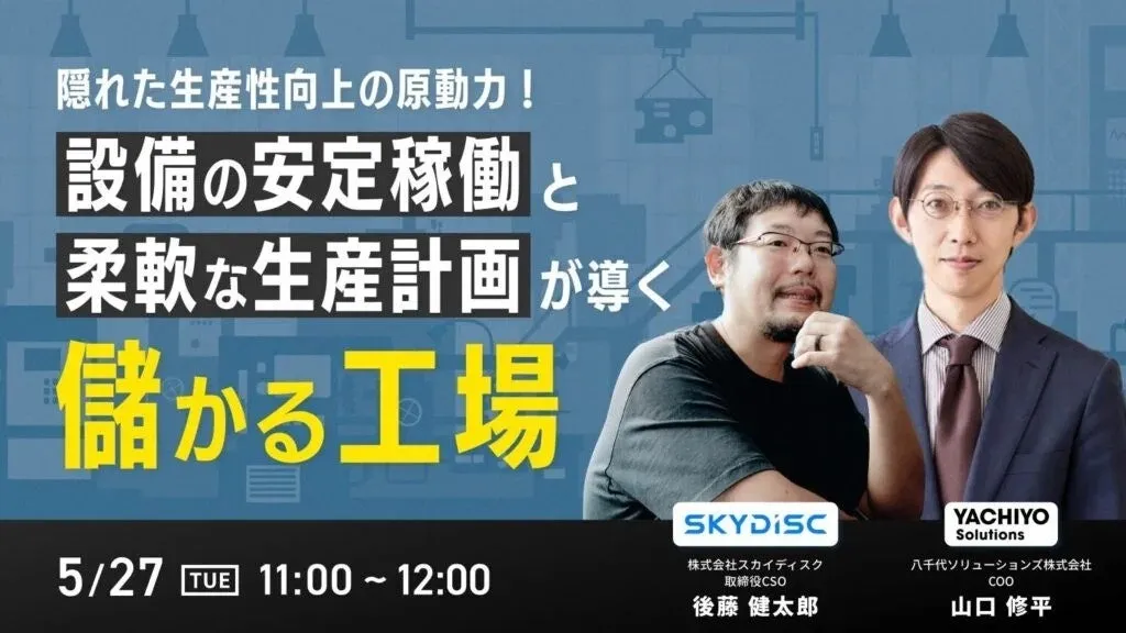 製造業を取り巻く環境は日々変化しており、特に昨今では人手不足や設備の老朽化、熟練技術者の引退といった課題に直面しています。こうした問題に対処するため、八千代ソリューションズ株式会社と株式会社スカイディスクが共同で、5月27日に無料のオンラインウェビナーを開催します。このセミナーのテーマは「隠れた生産性向上の原動力!設備の安定稼働と柔軟な生産計画が導く”儲かる工場”」。
