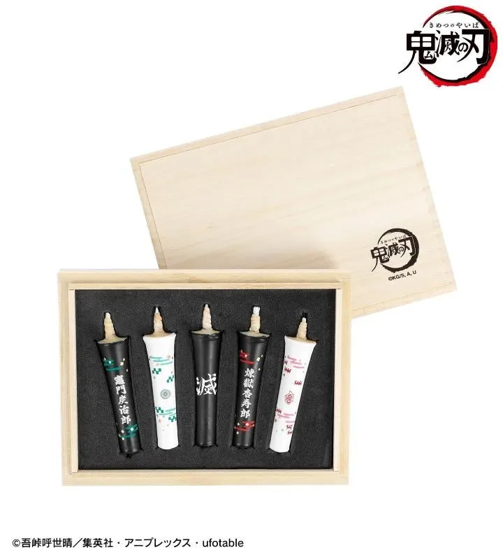 この桐箱入りのセットには、各キャラクターをイメージしたろうそくが含まれており、鬼殺隊の「滅」マークや、竈門炭治郎、煉獄杏寿郎の特徴的なアイコンや柄がデザインされています。これらは、お部屋のインテリアとしても映えること間違いなしです。