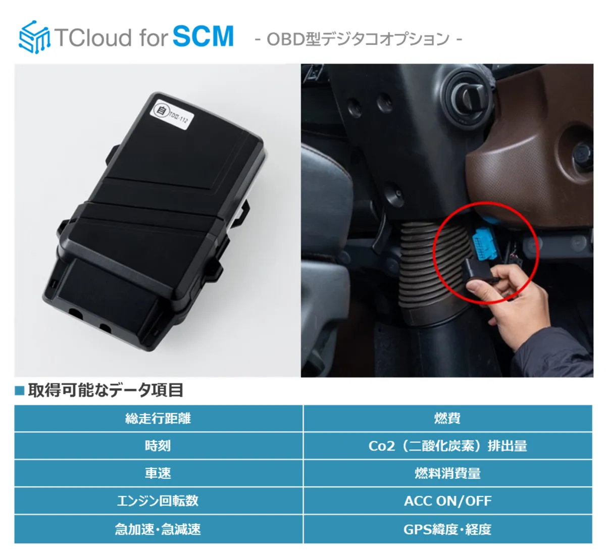 新たに提供されるOBD型デジタコ(型式名:OD420JP)は、2009年以降製造された車両に標準装備されているOBDⅡポートに接続することで、デジタコの機能を果たします。これにより、高額な導入コストを大幅に削減し、煩雑な工事を不要にします。また、車速やエンジン回転、燃費などの高精度な走行データをリアルタイムで「TCloud for SCM」へ送信することができるため、運行データと作業データの組み合わせによる詳細な分析が可能になります。