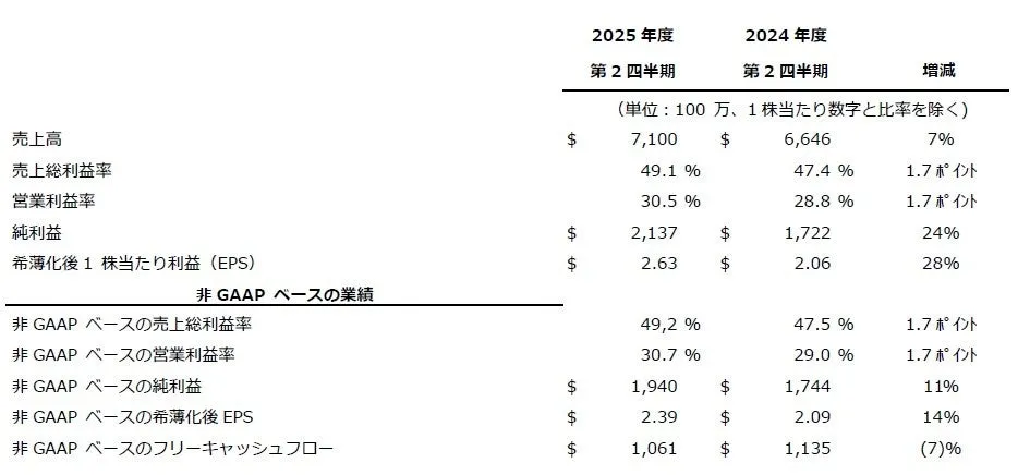 この四半期の営業利益率はGAAPベースで30.5%、非GAAPベースで30.7%となり、売上総利益率は、それぞれ49.1%、49.2%を記録しました。また、1株当たり利益はGAAPベースで過去最高の2.63ドル、非GAAPベースで2.39ドルとなり、前年比でいずれも増加しています。