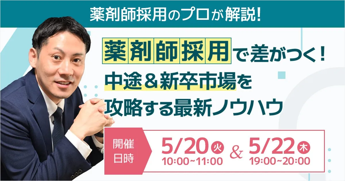 この度、薬剤師の採用を成功させるための最新トレンドを学べるオンラインセミナーを開催します。セミナーでは、市場のデータを基に中途採用や薬学生の採用、それぞれの成功戦略を具体的に解説します。