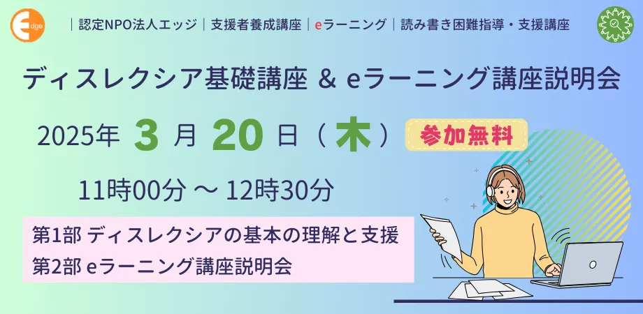 このような状況を改善し、正しい理解を促進するため、認定NPO法人エッジは、特にディスレクシアに特化した「基礎講座」と「eラーニング講座説明会」を開催します。