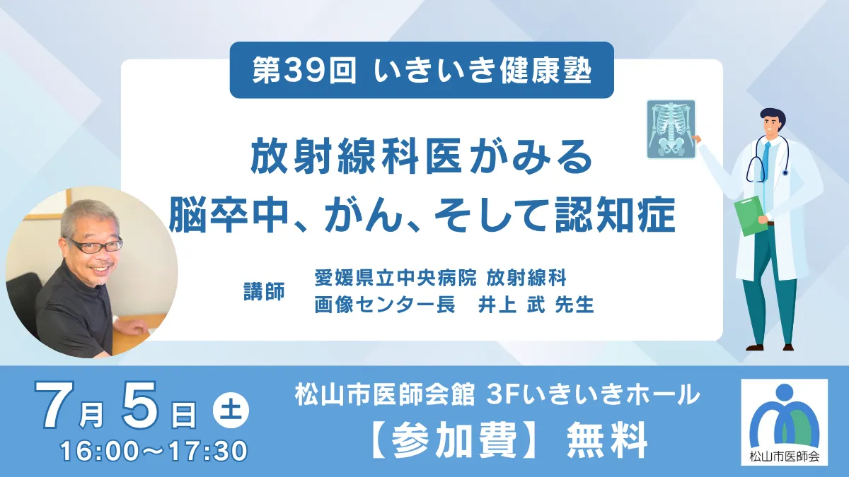 2025年7月5日(土)、愛媛県松山市にある松山市医師会館で「いきいき健康塾」が行われます。この講座では、四国地方の医療業界で著名な放射線科医、愛媛県立中央病院の井上武先生を迎え、脳卒中、がん、認知症に関する重要な知識が共有されます。参加は無料で、どなたでも気軽にご参加いただけます!