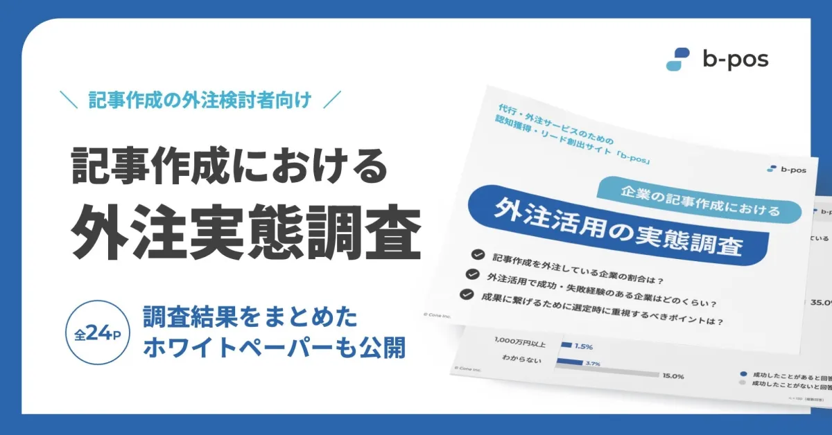 b-posでは、今回の調査結果を踏まえて、記事作成代行会社の比較記事を公開しています。外注活用を検討している企業は、ぜひ参考にしてみてください。また、ホワイトペーパーを通じて成功に導く具体的な手法を知ることができ、外注費用や業務内容の各社比較も行っているため、今後の選定に役立てられるはずです。