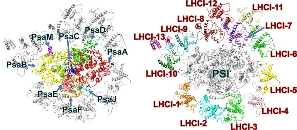 本研究では、ユーグレナ由来のPSI-LHCIの構造が2.82Åという高い分解能で決定されました。一般的にPSIは10種類以上のサブユニットから成るところ、ユーグレナのPSIはわずか8サブユニットから構成されることが分かりました。さらに、LHCIの配置は13個が非対称的に配置されており、伝統的な「LHCIベルト」を欠くという非典型的な特徴が確認されました。これによって、ユーグレナの光合成システムが独自の進化を遂げてきたことがわかります。