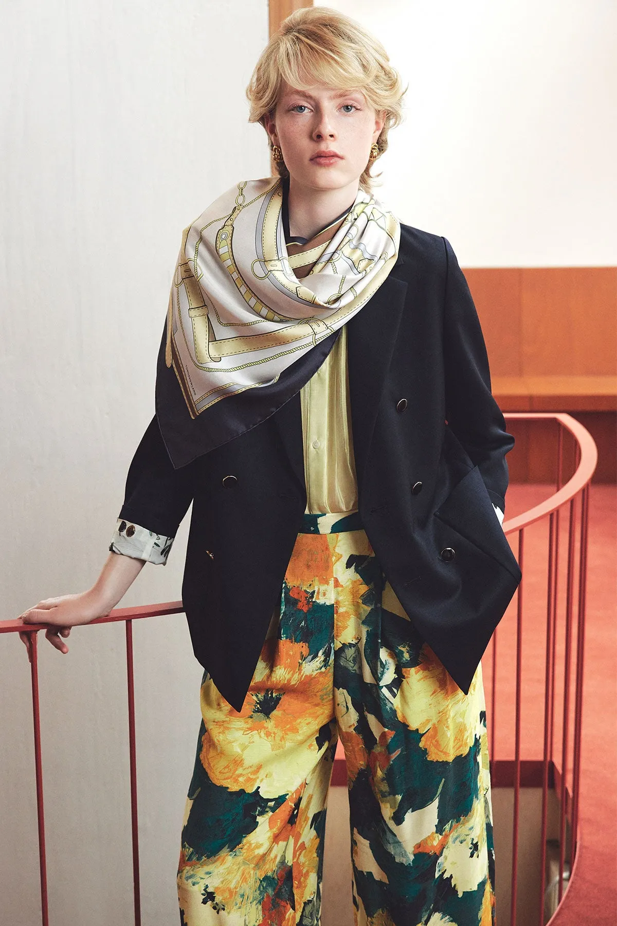 凛としたハリと艶を持ったウールモヘアのダブルブレストブレザーは、リラックスした雰囲気を演出します。繊細なアートプリントが気品を与え、着るだけでブランドの矜持を感じさせる逸品です。