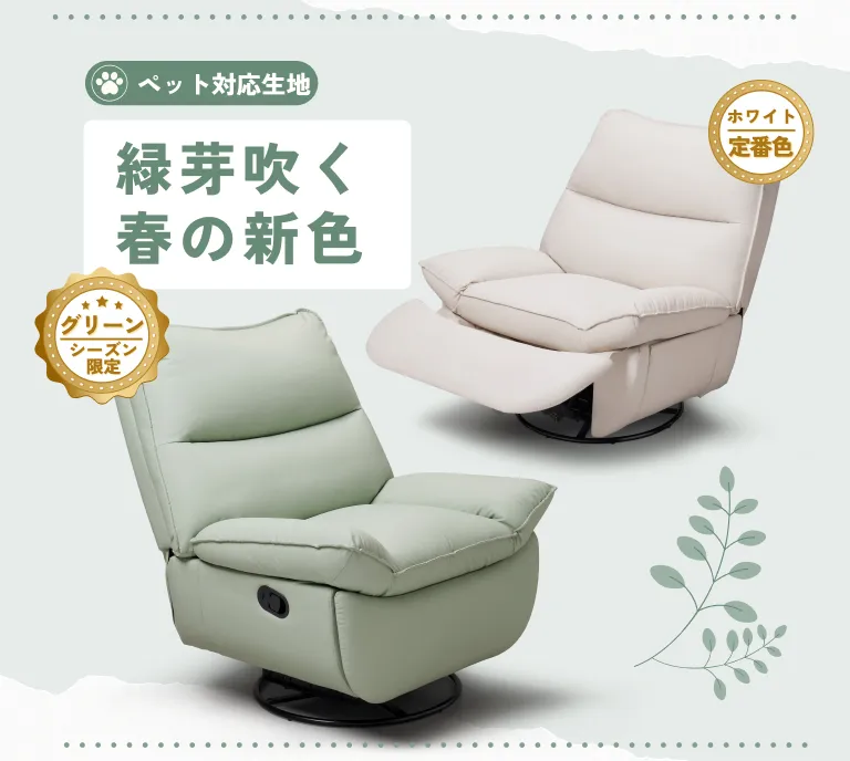 新色の「ホワイト」は、洗練された佇まいで、PUレザーとの組み合わせにより、どんな空間にもマッチします。ホワイトの持つ清潔感は、特に明るい春の日差しと相性が良く、リビングや寝室でおしゃれなアクセントとなるでしょう。また、「グリーン」は、フレッシュでナチュラルな色合いが特徴で、春の訪れを感じさせる爽やかさを兼ね備えています。どちらの色も、居心地の良い空間を作り出し、リラックスした時間を提供してくれることでしょう。