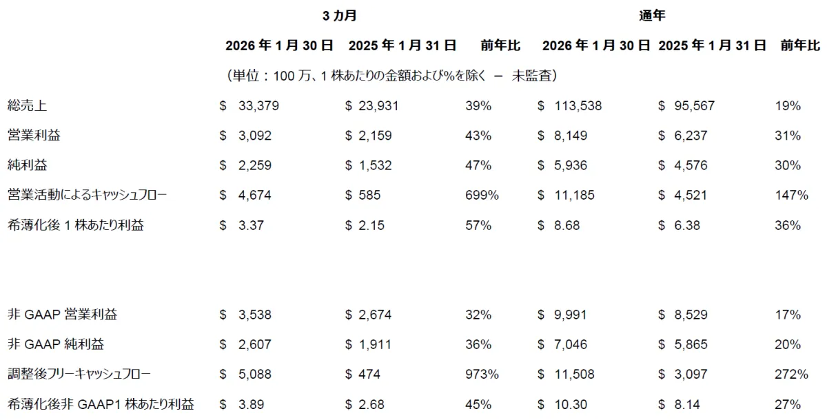 同社の2026会計年度は、売上高が前年比19%増加し、ついに1,135億ドルに達しました。この成長は、特にAI関連のソリューションによるもので、市場の需要をしっかりと捉えた結果と言えるでしょう。また、希薄化後1株あたりの利益(EPS)も前年から36%増の8.68ドル、非GAAPベースでは27%増の10.30ドルを記録しました。営業キャッシュフローも過去最高の112億ドルとなり、財務状況は非常に健全です。