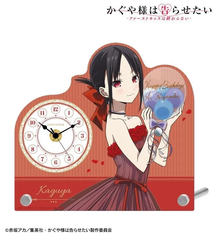 最初にご紹介するのは、四宮かぐやと早坂愛の描き下ろしイラストを使用したアクリルスタンド時計です。サイズは約19.7×18.5cmで、スタンドが付属しているため簡単に設置可能。お部屋やデスクに飾ることで、キャラクターとのいっそうの親近感を楽しむことができます。価格は各5,500円(税込)です。