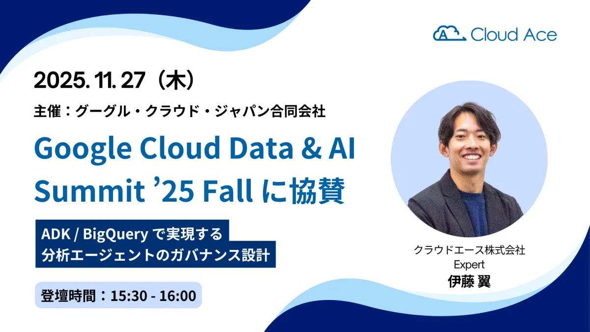 イベントの中で、クラウドエースのエンジニア、伊藤翼が登壇し、「ADK / BigQueryで実現する分析エージェントのガバナンス設計」についてのセッションを行います。このセッションでは、AIエージェントを活用したデータ分析におけるリスク(データ破壊、高額課金、個人情報漏洩など)について詳しく解説し、安全かつ信頼性の高い分析エージェントの構築・運用方法を紹介します。