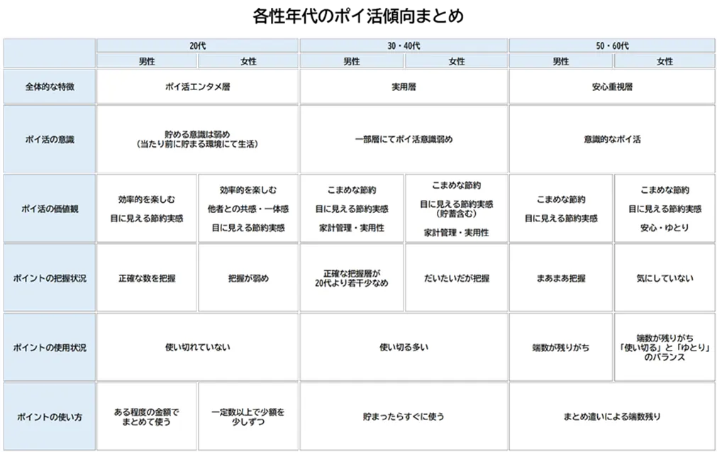さらに興味深いのは、世代ごとにポイントの管理スタイルが異なる点です。ある世代はポイントをしっかりと管理し、計画的に使おうとする傾向が強い一方で、他の世代は貯めっぱなしになってしまうことが多いとされています。このことから、各世代に適したポイント管理や活用の支援が求められていることが明確になりました。