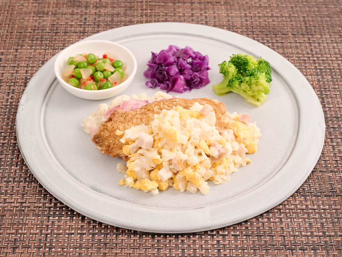 「アジフライのとろじゃが洋風仕立て」では、アジフライの下にふんだんに敷かれたなめらかなマッシュポテトが食感のアクセントとなり、一口食べるごとに違った味わいを楽しめます。その上には、シャキシャキ感のあるキャベツ、スクランブルエッグ、ベーコン、そしてとろけるチーズが重なり、見た目にも楽しめる一皿が完成しています。これによって、様々な食感や風味が絡み合い、最後まで飽きることなく楽しめる仕上がりとなっています。