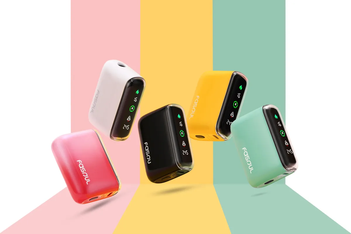 「Fasoul Q1 PRO」は、約52.5mm x 68.6mm x 27.5mmのコンパクトなサイズで、重量は約82.69gと持ち運びにも便利です。バッテリー容量は1800mAhで、約90分の充電時間で最大20本の連続吸引が可能です。カラーはブラック、ホワイト、イエロー、シアン、そしてグラデーションピンクの5色が用意されています。