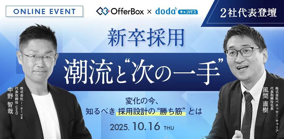 2025年10月16日(木)、新卒オファー型就活サービス「OfferBox」を運営する株式会社i-plugと、dodaキャンパスを運営する株式会社ベネッセ i-キャリアが共催するセミナーがオンラインで行われます。このセミナーのタイトルは「新卒採用潮流と“次の一手” 変化の今、知るべき採用設計の“勝ち筋”とは」。新型コロナウイルスの影響や昨今の働き方の変化により、今の採用市場は大きく変わりつつあります。このセミナーでは、その変化を捉え、成功につながる採用設計について議論を深めます。