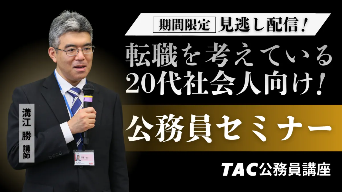 TACでは、2025年11月22日(土)に大宮校で行われた公務員セミナーのアーカイブを限定配信中です。このオンラインセミナーは特に転職を考えている20代の社会人に向けており、公務員としてのキャリアを考える上での貴重な情報源となります。