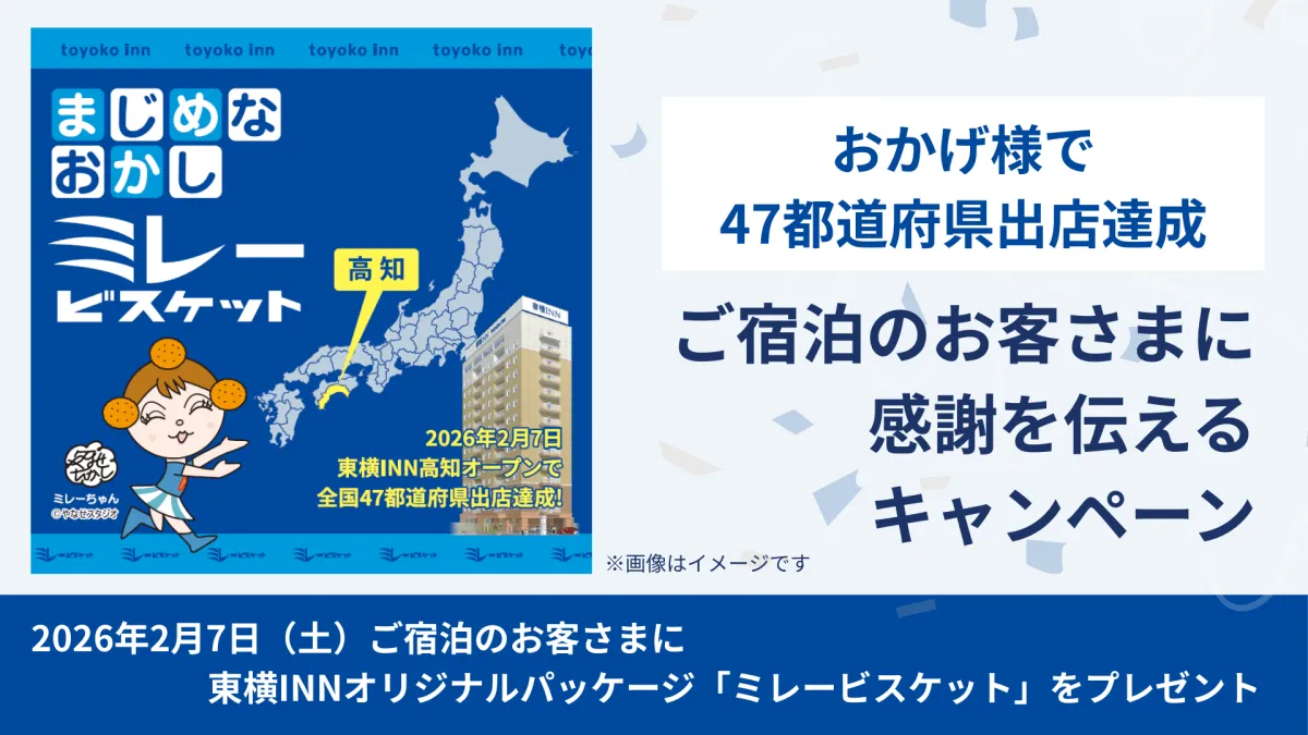 2026年2月7日、大人気のビジネスホテルチェーンである株式会社東横インが、待望の「東横INN高知」をオープンし、ついに全国47都道府県への出店を達成しました。この記念すべき日には、全国の東横INNに宿泊されたお客様に、高知県の名物お菓子「ミレービスケット」を無料でプレゼントするキャンペーンも実施されます。