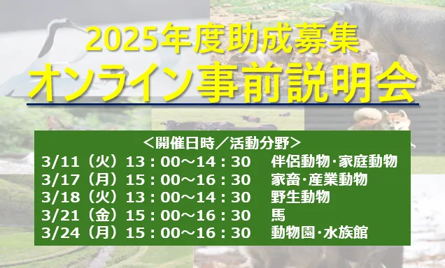 2025年度の助成金募集にあたって、JAC環境動物保護財団は今年度の活動分野ごとにオンラインでの事前説明会を設けることを決定しました。この説明会では、理事長が財団の趣旨や目的、助成対象について丁寧に説明します。説明会は全国からオンライン参加が可能で、視聴希望者はぜひ参加していただきたいとされています。