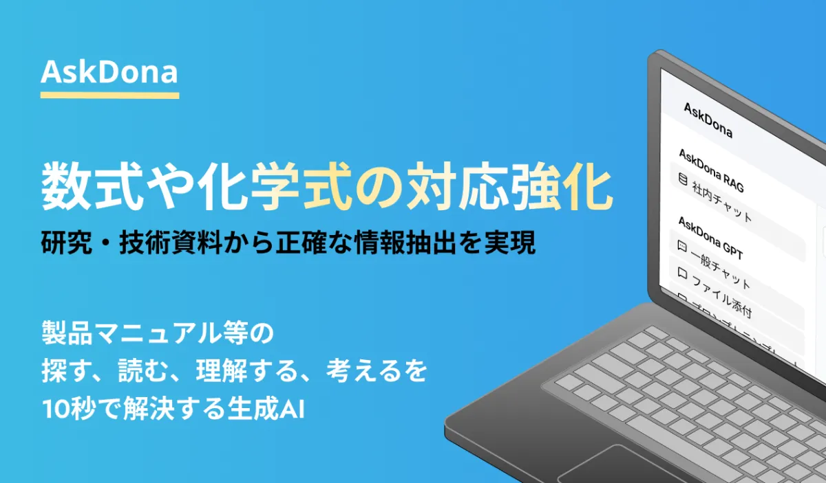 株式会社GFLOPSが提供する法人向けの生成AIアシスタント「AskDona」が、数式や化学式の抽出機能を新たに実装しました。これにより、研究開発部門が直面してきた情報抽出の課題が解決され、効率的なデータ分析が可能になります。