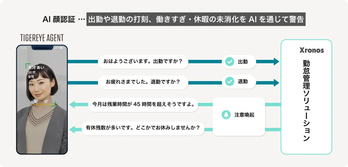 さらに、TIGEREYEが手掛けるAIアバターとの連携も進められています。この連携により、出退勤の打刻とともに、AIとの会話を通じて業務状況の確認や注意喚起を行う新たな勤怠管理機能の実装が予定されています。これにより、よりスマートで効率的な業務運営が期待されます。