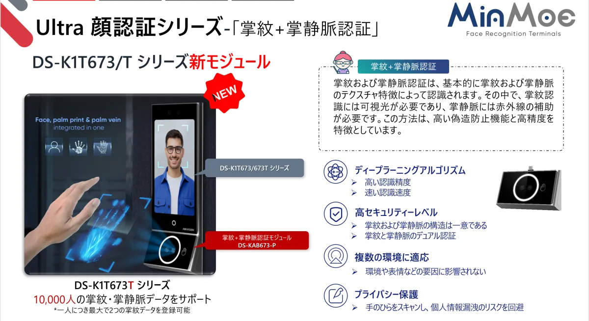 2020年に「MinMoe」顔認証シリーズを世に送り出したHikvision。以来、生体認証技術の革新を先駆けて進めており、最新のDS-K1T673シリーズでは虹彩認証、顔認証、手のひら認証を組み合わせた複合的なアクセス制御ソリューションを提供しています。特に注目されるのが、今年新たに発売されたDS-KAB673-PのUSBインターフェースモジュールです。