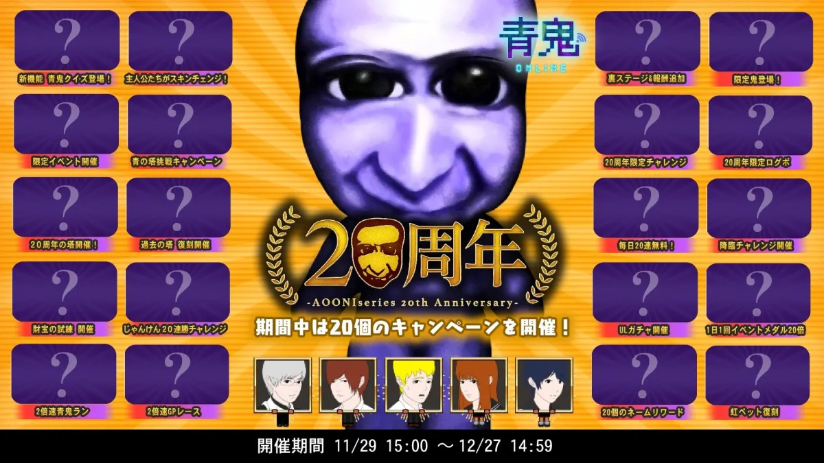 スマートフォン向けの人気ホラーゲーム『青鬼オンライン』が、シリーズ20周年を迎え、2024年11月29日(金)から特別イベントを開始します。このイベントでは、最大100人が参加し、青鬼から逃げるサバイバルゲームが楽しめます。期間中、20個のキャンペーンが実施され、さまざまな新モードや限定アイテムが登場します!