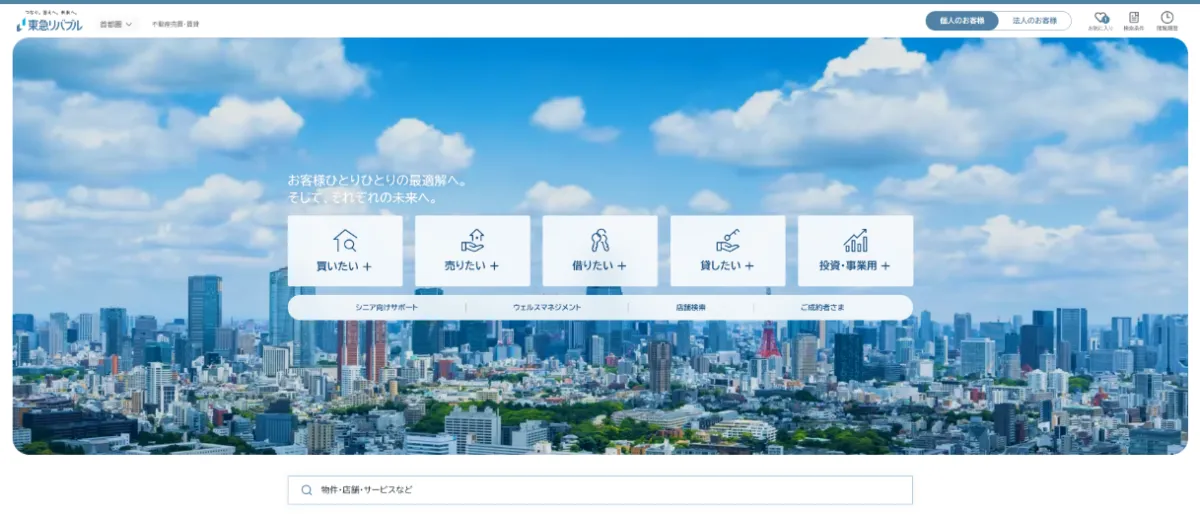 TOPページの情報設計の刷新: メインビジュアルに動画を取り入れ、個人・法人別のメニュー切替機能を強化します。また、新築分譲マンションや海外不動産などの情報を紹介する新しいセクションも設けます。