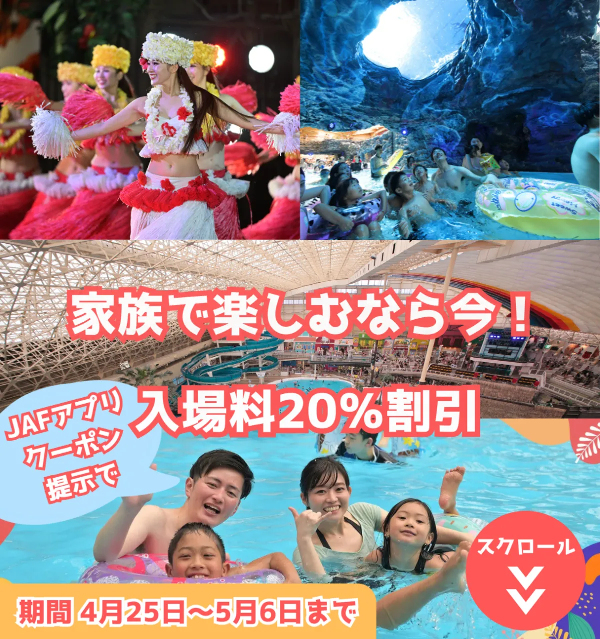 JAF福島支部は、4月25日(金)から5月6日(火・休)までの期間中、スパリゾートハワイアンズで使える「JAFアプリクーポン」を特別に配信します。このクーポンを提示すると、なんと入場料が20%も割引されるため、家族全員が大変お得に楽しむことができます。大人や小学生、幼児を含む最大5名まで利用可能です。