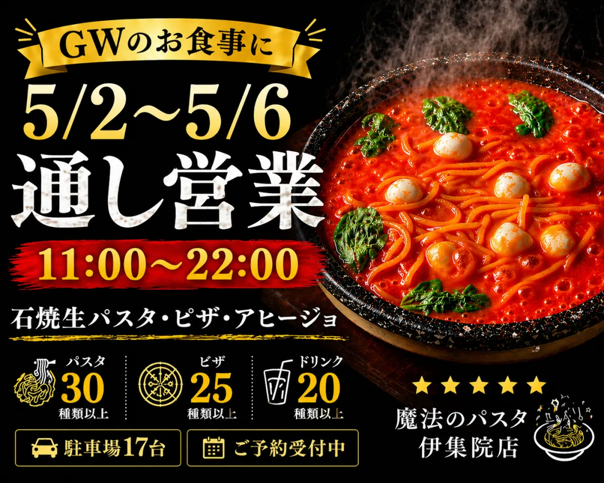 鹿児島県の日置市伊集院町に位置する「魔法のパスタ伊集院店」は、2026年5月2日から5月6日までのゴールデンウィーク期間中、特別に通し営業を行います。この期間、営業時間は11:00から22:00までと長めに設定されており、家族や友人との食事にぴったりです。