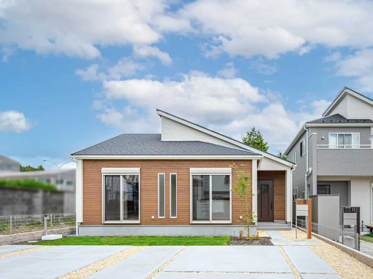 外観は、落ち着いたテイストで、なだらかな屋根が空を広く見せる、街並みに溶け込むデザインを採用しています。ゆったりとした敷地に建つコンパクトな平屋は、開放感あふれる空間を生み出します。