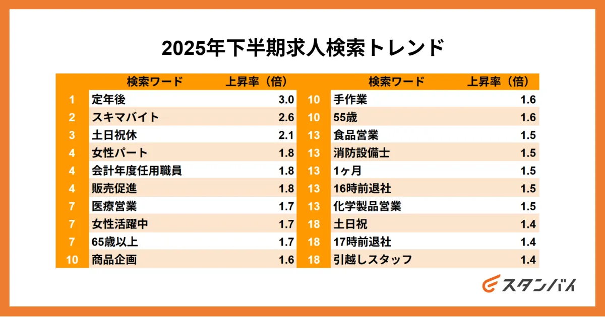 株式会社スタンバイが運営する求人情報一括検索サイト「スタンバイ」が、2025年の下半期における求人検索トレンドを発表しました。この調査は、2025年6月1日から11月30日までの期間に使用された検索ワードをもとに行われ、特に注目すべき3つの傾向が明らかになっています。