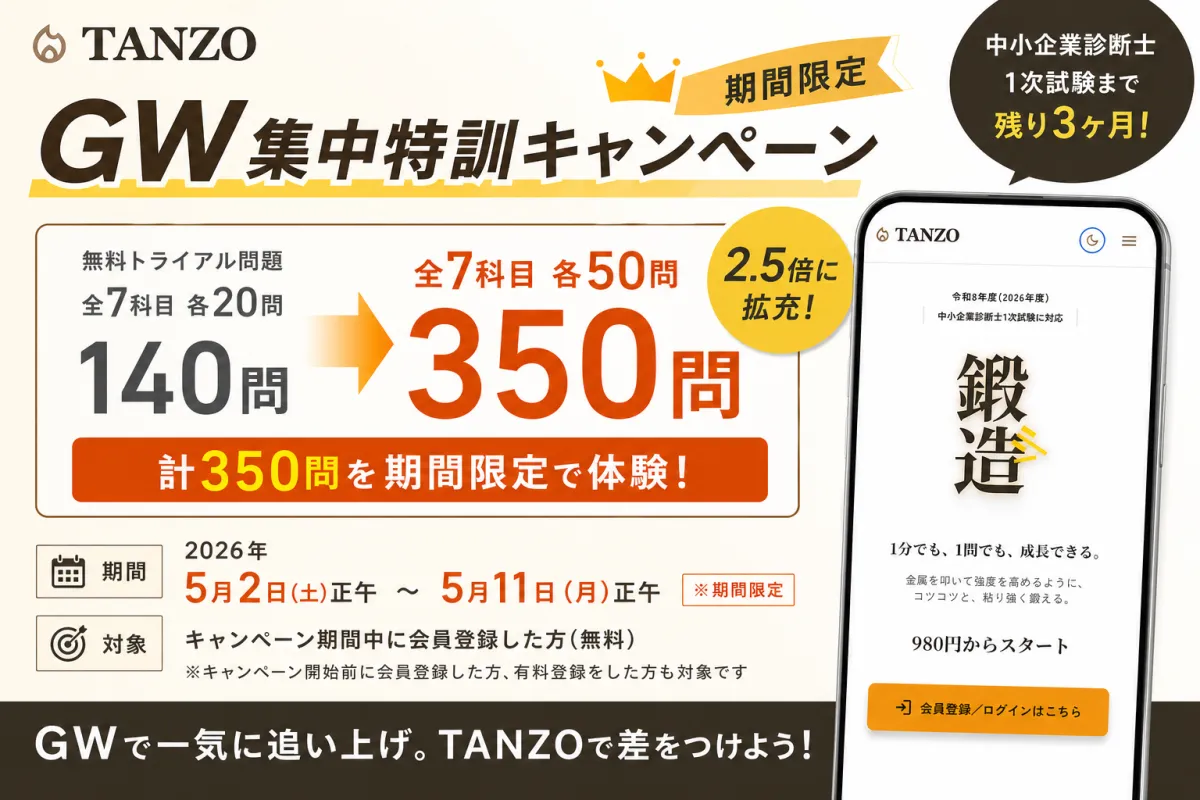 TANZO株式会社は、東京都港区に本社を置き、中小企業診断士1次試験に特化したオンラインドリル「TANZO」を運営しています。今回は特に受験生の成功を応援するためにこのキャンペーンを行っています。